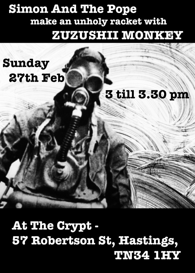30 minutes of Sunday Sonic groove from drum and bass bashers Simon And The Pope with sound stretchers ZUZUSHII MONKEY. Sunday27th Feb at The Crypt, 57 Robertson St, Hastings, TN34 1HY.
